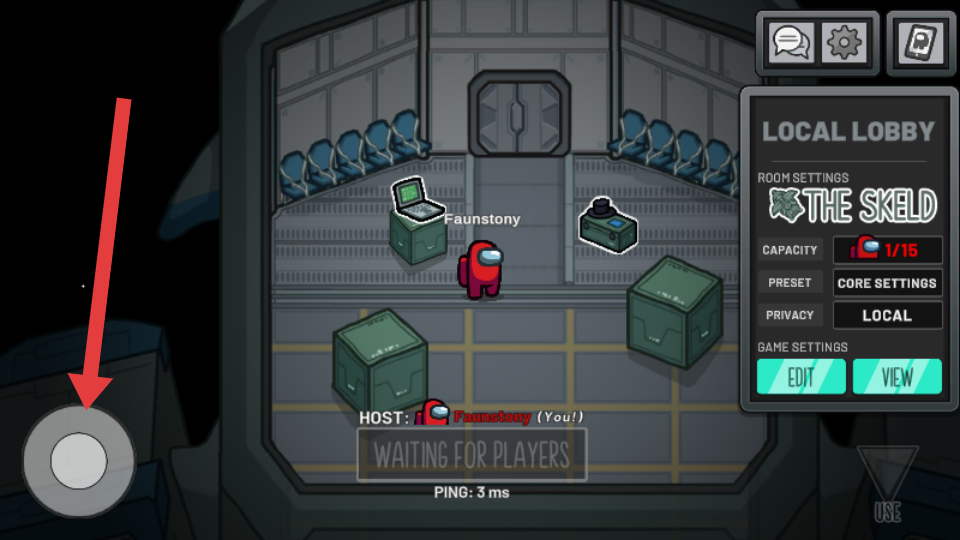 3、進(jìn)入本地房間后,界面左下角會(huì)出現(xiàn)圓形操控按鈕,通過(guò)滑動(dòng)該按鈕,可控制太空船員角色在飛船艙內(nèi)移動(dòng),為完成任務(wù)找出內(nèi)鬼做準(zhǔn)備。