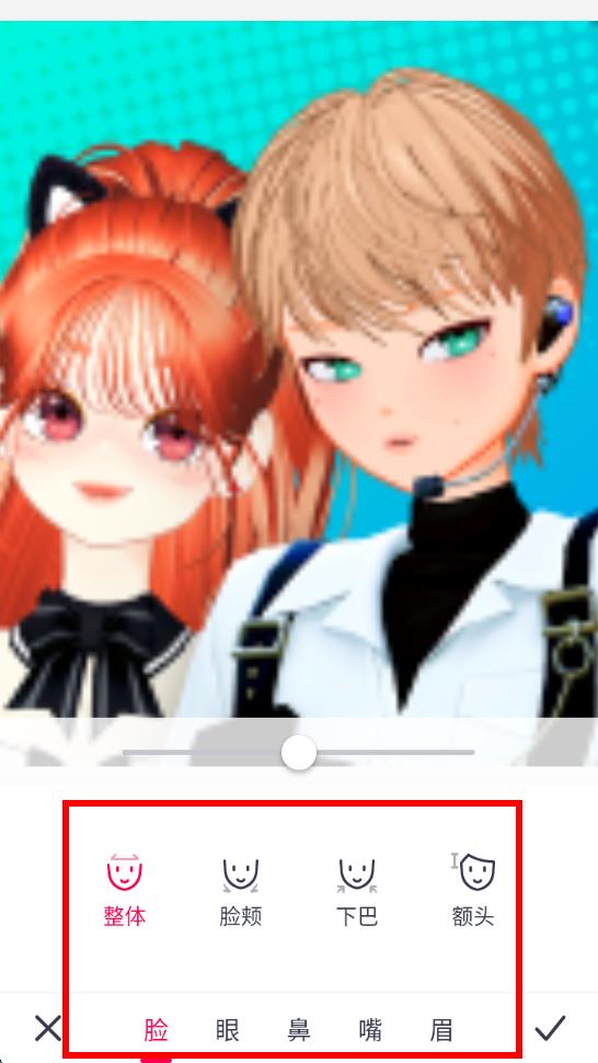 3、選中圖片后,利用下方出現(xiàn)的整體、臉頰、下巴、額頭等修圖功能選項,對圖片進行細致調(diào)整和美化。
