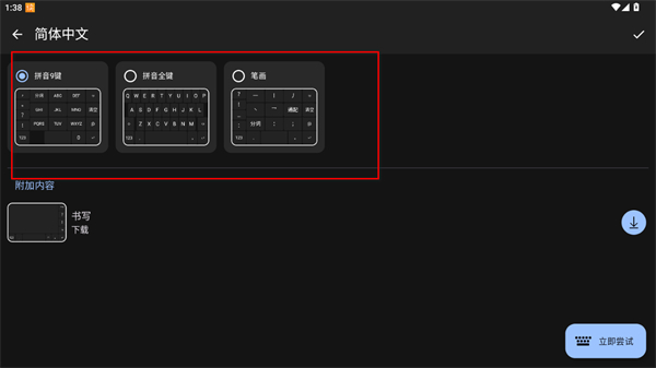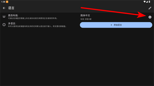 3、在簡體中文設(shè)置詳情頁,選擇想要的鍵盤布局,如拼音9鍵、拼音全鍵、筆畫中的一種。