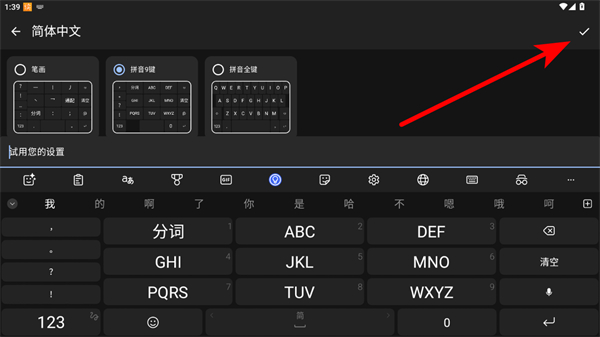 4、選好鍵盤布局后,點擊頁面右上角的√進(jìn)行確認(rèn),完成鍵盤布局切換。