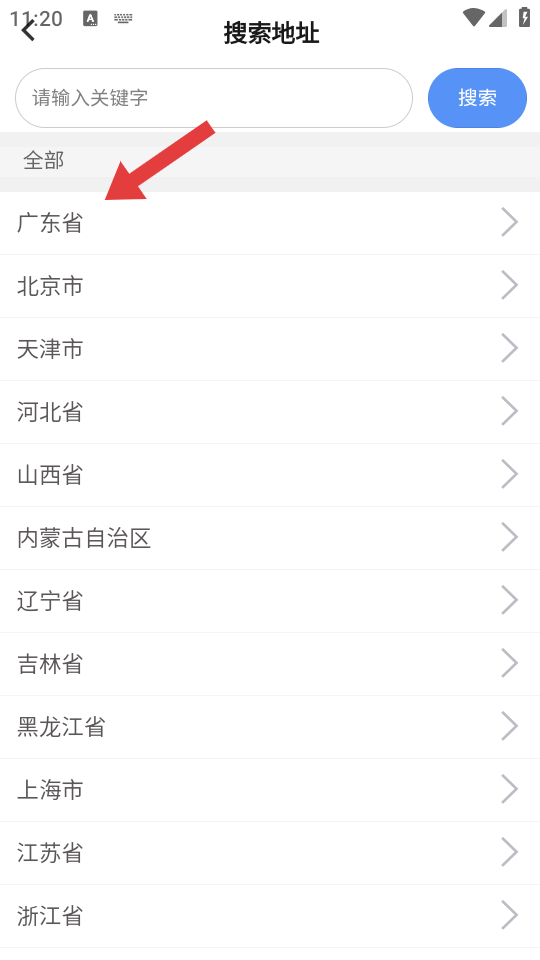 3、在搜索地址界面,可通過搜索關(guān)鍵詞,或直接點(diǎn)擊目標(biāo)省份,選擇要關(guān)注的具體地點(diǎn)。