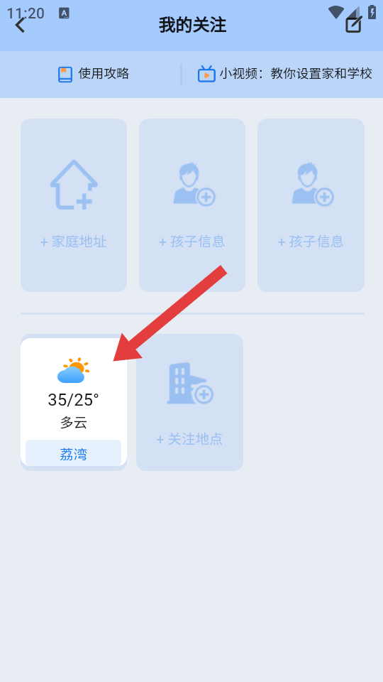 4、選擇地點(diǎn)后,返回我的關(guān)注頁(yè)面,即可看到該地點(diǎn)的天氣信息卡片,完成地點(diǎn)關(guān)注。