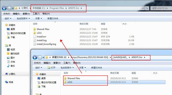 9、打開文件夾solidsquad--ansys inc,將里面的"shared files","v211"兩個(gè)文件夾復(fù)制到軟件根目錄下,默認(rèn)路徑【c:\program files\ansys inc】
