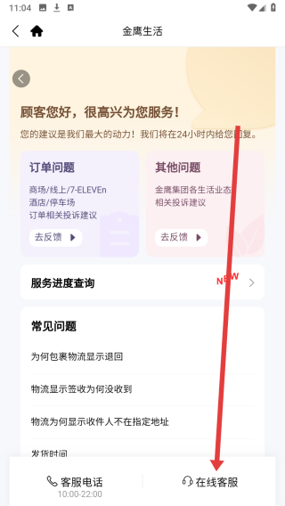 3、在進(jìn)入到金鷹生活頁面中,可以點(diǎn)擊下方在線客服按鈕,進(jìn)入聯(lián)系。
