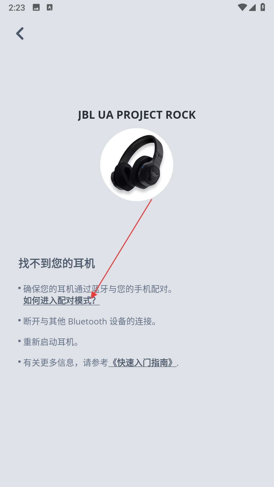 3、要是出現(xiàn)找不到您的耳機(jī)的提示,就點(diǎn)擊如何進(jìn)入配對(duì)模式,查看耳機(jī)進(jìn)入藍(lán)牙配對(duì)模式的操作方法。