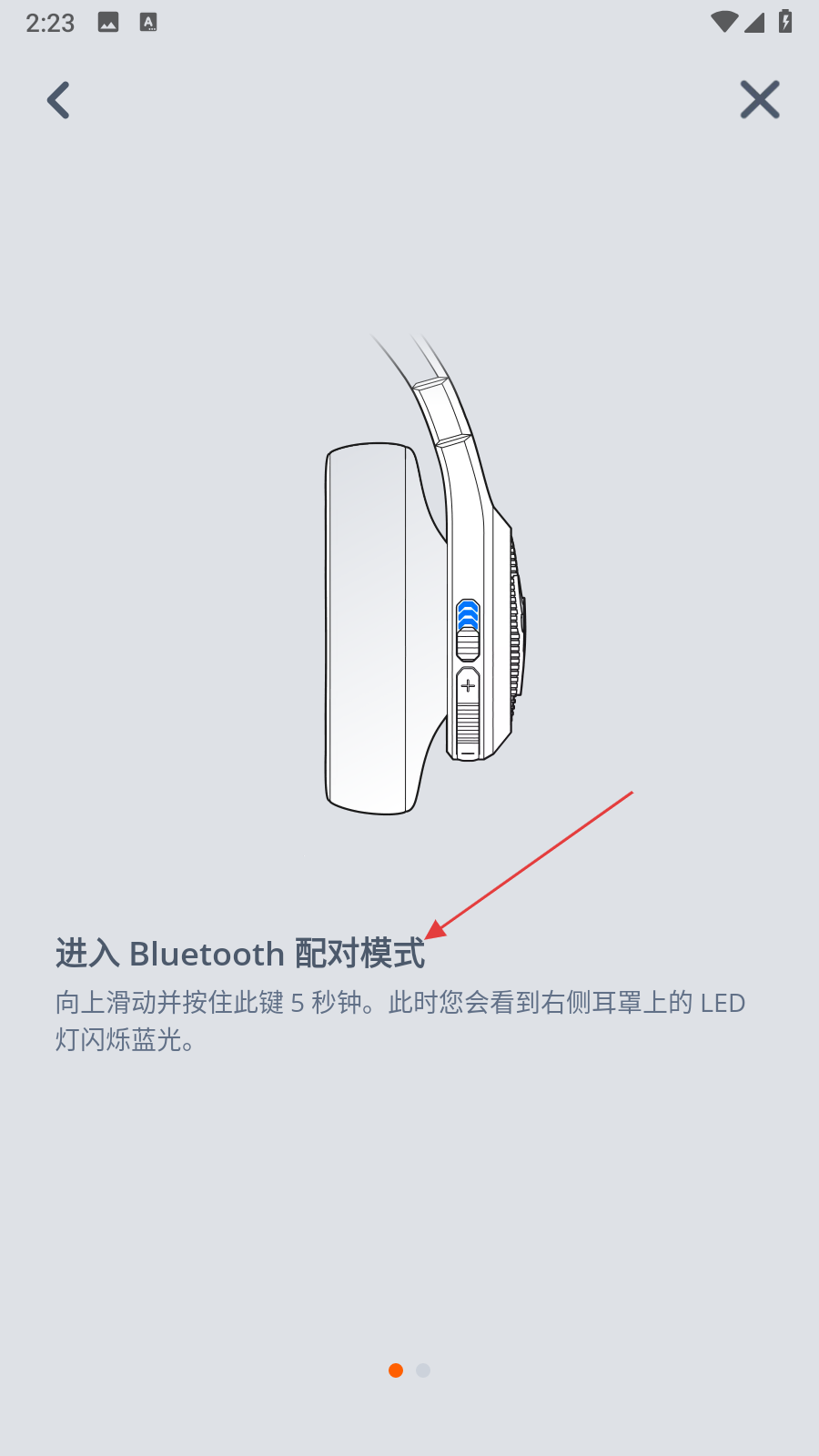 4、按照指引,向上滑動(dòng)并按住耳機(jī)的指定按鍵5秒鐘,等右側(cè)耳罩的LED燈閃爍藍(lán)光,耳機(jī)就進(jìn)入了藍(lán)牙配對(duì)模式。