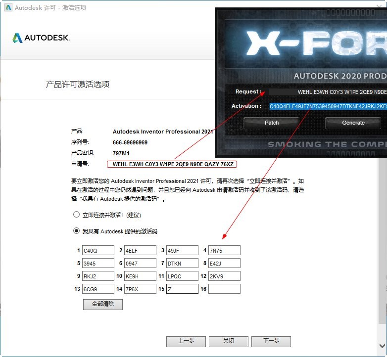 8、以管理員身份運(yùn)行注冊機(jī),將申請?zhí)枏?fù)制到注冊機(jī),點擊pathc,點擊generate,生成激活碼,將激活碼復(fù)制到軟件激活頁面,點擊下一步;