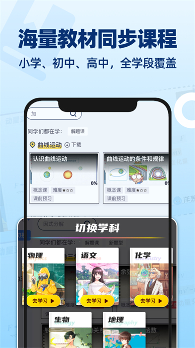 小初高數(shù)學(xué)、物理、化學(xué)、語(yǔ)文、英語(yǔ)、生物這里都有,課程同步校內(nèi)課本教材,知識(shí)點(diǎn)逐一講解,難易度自由切換,滿足不同階段學(xué)生學(xué)習(xí)需求?;A(chǔ)知識(shí)鞏固、重難點(diǎn)提升、章節(jié)總結(jié)、知識(shí)點(diǎn)脈絡(luò)梳理、復(fù)習(xí)、預(yù)習(xí)、考前沖刺、課后作業(yè)、日常學(xué)習(xí)來(lái)洋蔥,幫你鞏固知識(shí)打牢基礎(chǔ),輕松應(yīng)對(duì)大小考試!