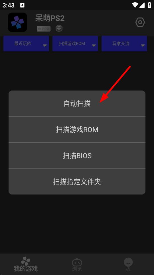 3、在彈出的菜單里,選擇自動掃描選項,模擬器開始掃描游戲文件。