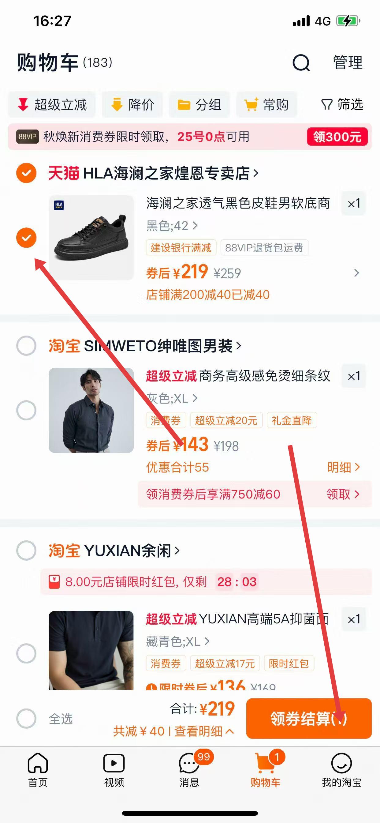 1、打開淘寶APP,點(diǎn)擊底部「購(gòu)物車」,進(jìn)入購(gòu)物車頁面后,勾選想要購(gòu)買的商品,點(diǎn)擊「領(lǐng)券結(jié)算」或「結(jié)算」。