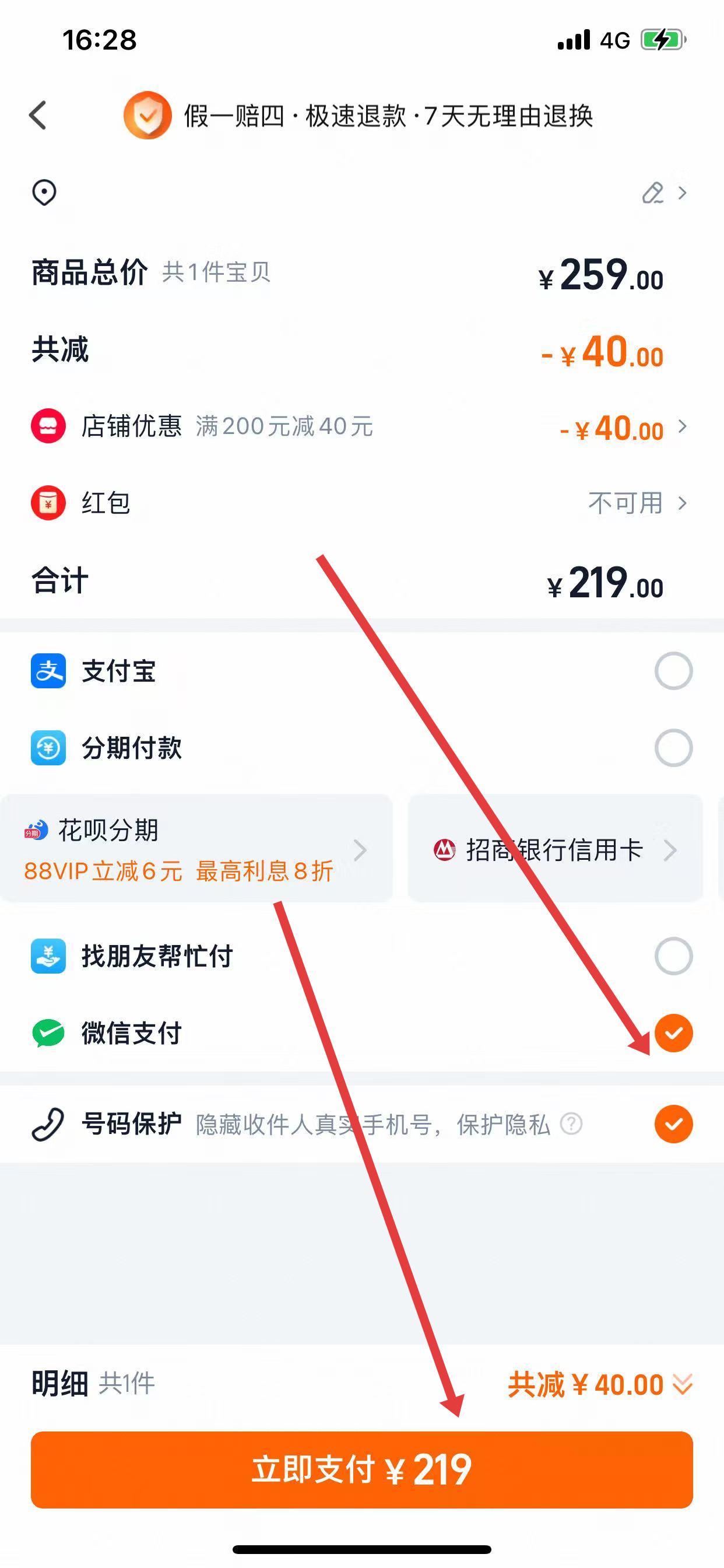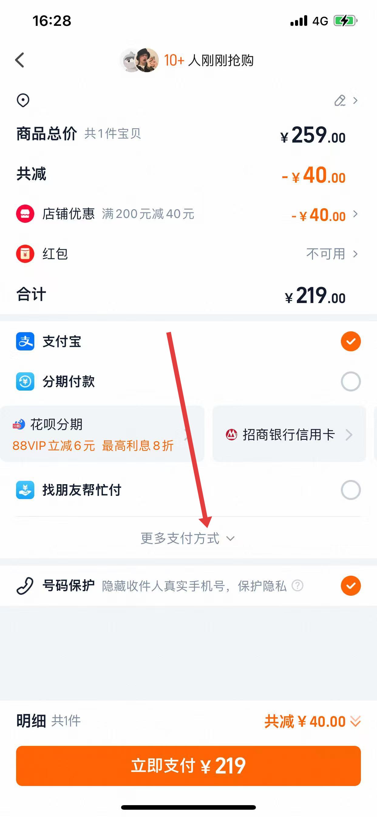 2、在訂單確認(rèn)頁面,確認(rèn)收貨地址、商品信息無誤后,點(diǎn)擊支付方式區(qū)域的「更多支付方式」。