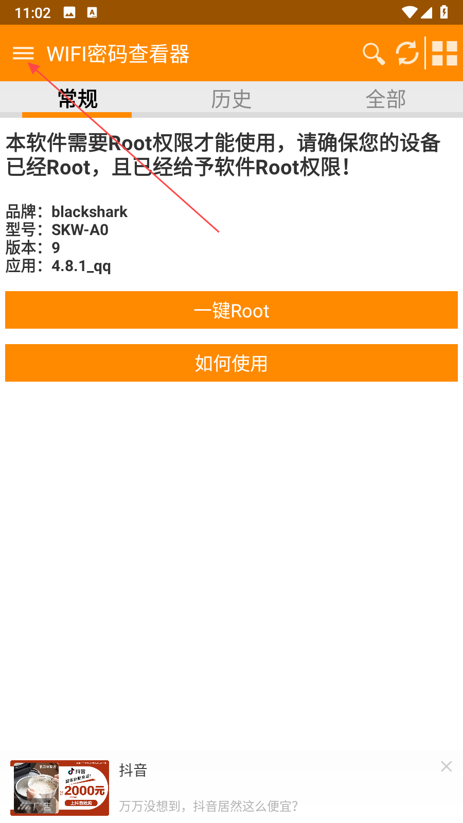 1、打開WIFI密碼查看器軟件,點(diǎn)擊界面左上角的三條橫線菜單圖標(biāo),打開軟件側(cè)邊菜單。