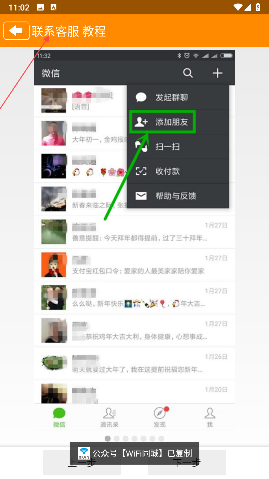 3、在聯(lián)系客服教程頁面,按照提示操作,打開微信,點(diǎn)擊添加朋友,通過查找指定公眾號,關(guān)注相關(guān)公眾號獲取客服聯(lián)系方式。
