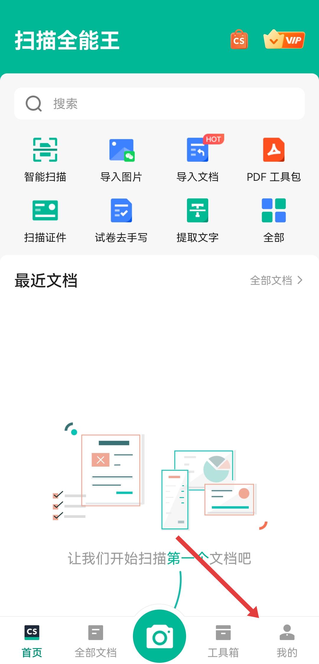1、打開掃描全能王APP,點(diǎn)擊界面右下角的我的,進(jìn)入個(gè)人頁面。