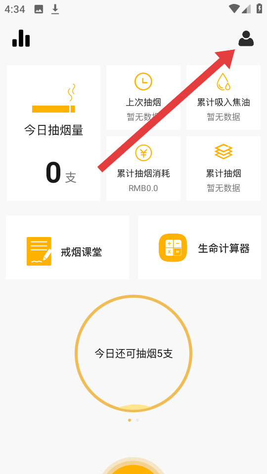 1、打開今日戒煙APP,需要點擊首頁右上角人形頭像的圖標(biāo),進(jìn)入個人功能頁面,開啟登錄流程第一步。