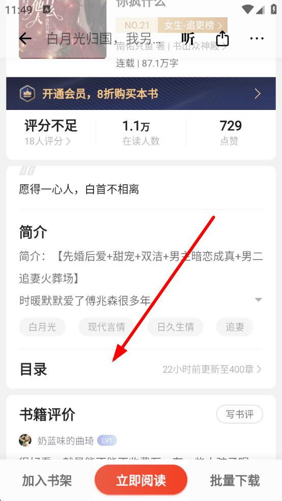 2、在書籍詳情頁(yè),找到并點(diǎn)擊目錄選項(xiàng),進(jìn)入目錄界面。