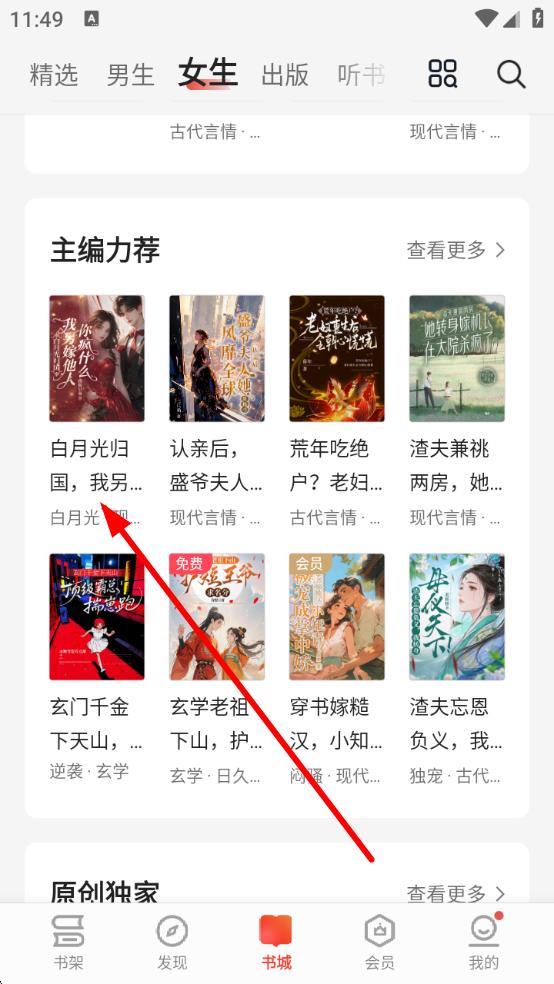 1、進(jìn)入愛(ài)讀掌閱書城女生頻道,找到主編力薦里的書籍,點(diǎn)擊進(jìn)入書籍詳情頁(yè)。