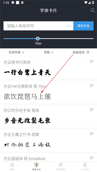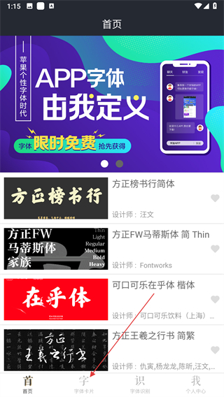 2、在字體卡片頁面,滑動下方的字體列表,挑選心儀的字體樣式。
