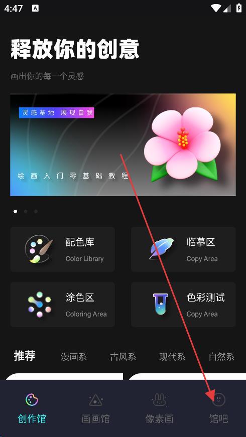 1、打開(kāi)App,點(diǎn)擊底部導(dǎo)航欄右下角的館吧選項(xiàng)。
