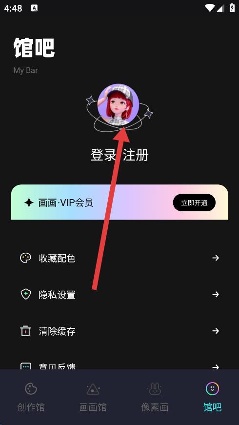 2、在館吧頁(yè)面,點(diǎn)擊頭像位置的登錄/注冊(cè)按鈕。
