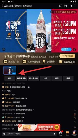 3、點(diǎn)擊看點(diǎn)的按鈕,可查看本場(chǎng)比賽的賽事看點(diǎn),也可選解說,如戰(zhàn)術(shù)分析、粵語解說或英文原聲,實(shí)現(xiàn)同一場(chǎng)次,不同解說自由換。