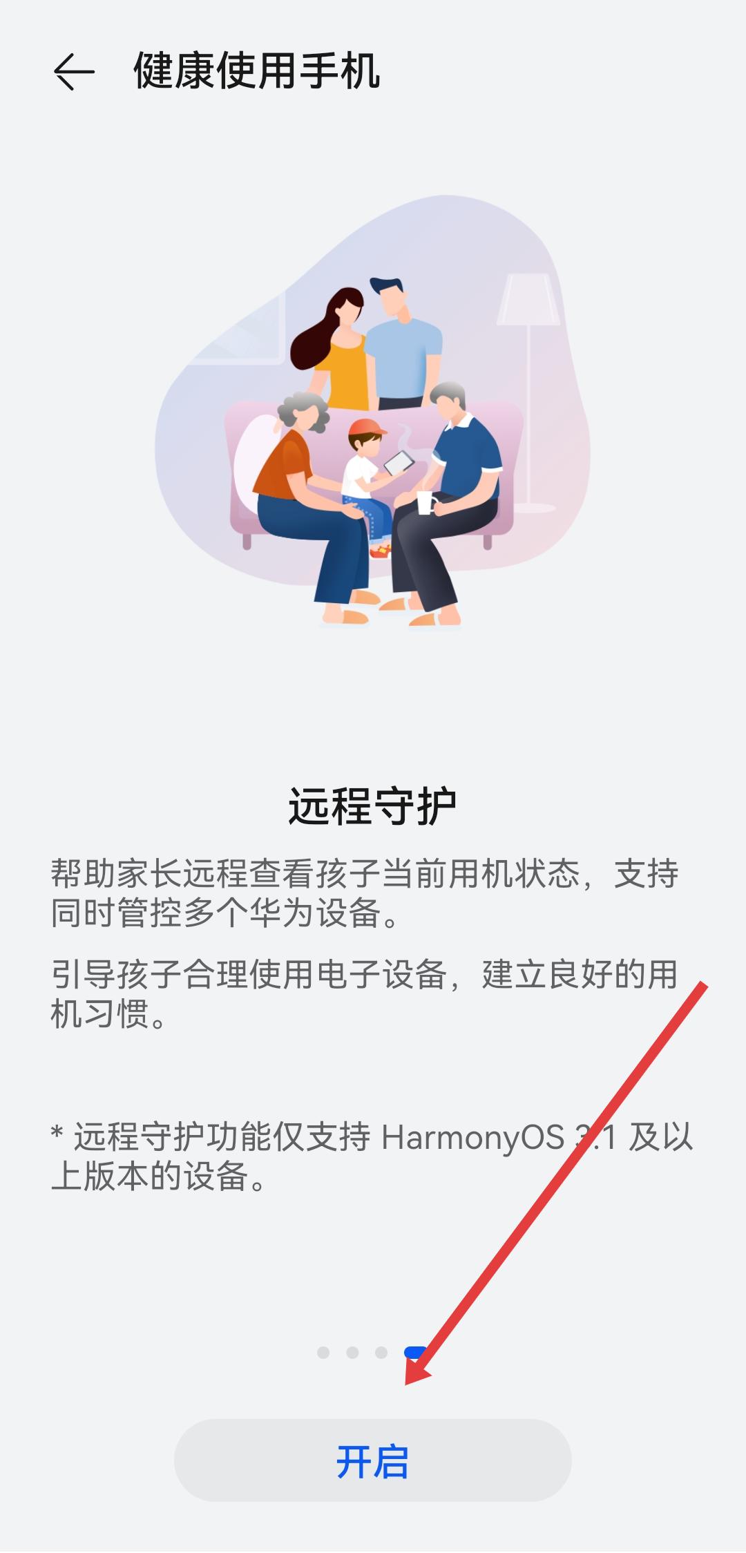 3、在健康使用手機(jī)的頁面,點(diǎn)擊開啟的按鈕,進(jìn)入使用者選擇流程。