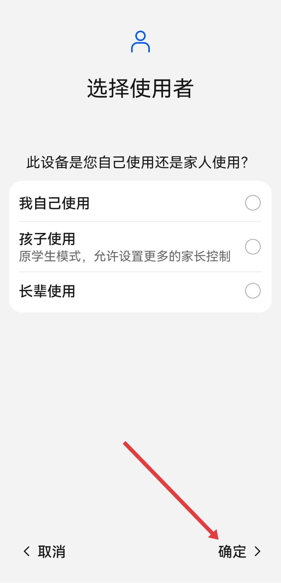 4、在選擇使用者頁面,選擇孩子使用選項(xiàng),點(diǎn)擊右下角確定按鈕,即可完成防沉迷設(shè)置。