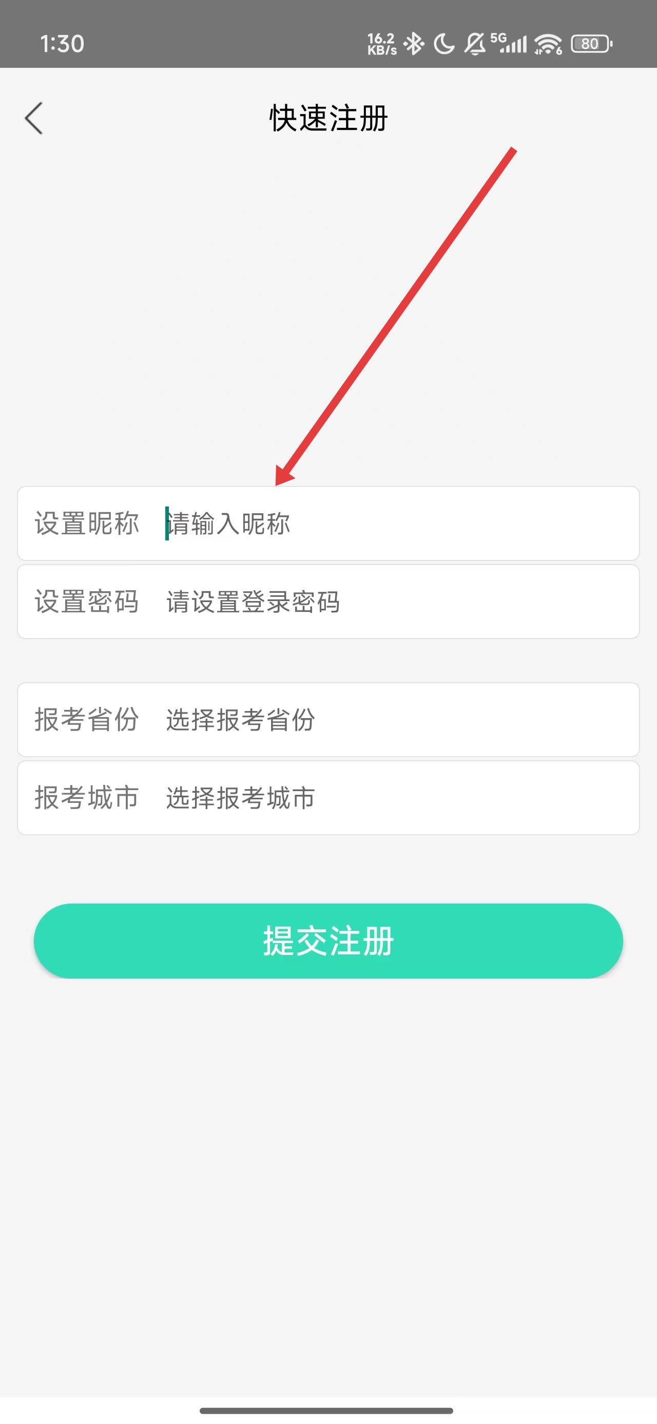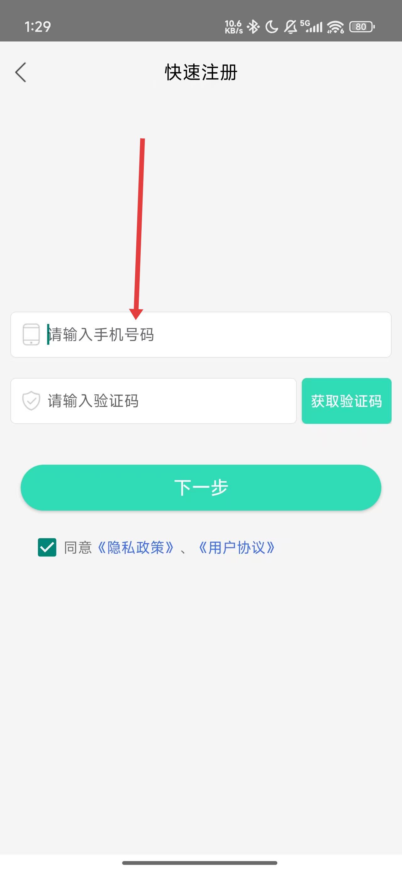 3、在跳轉(zhuǎn)到快速注冊頁面后,可以通過點擊輸入框填寫手機后獲取驗證碼后,進入下一步。
