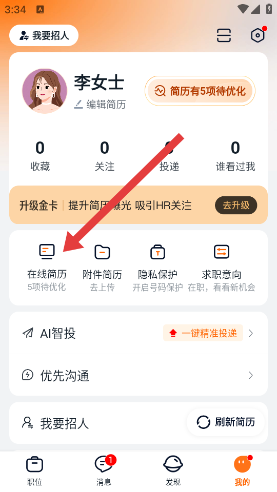 1、打開(kāi)獵聘APP,進(jìn)入我的頁(yè)面,點(diǎn)擊個(gè)人信息下方的編輯簡(jiǎn)歷,進(jìn)入中文簡(jiǎn)歷編輯界面。