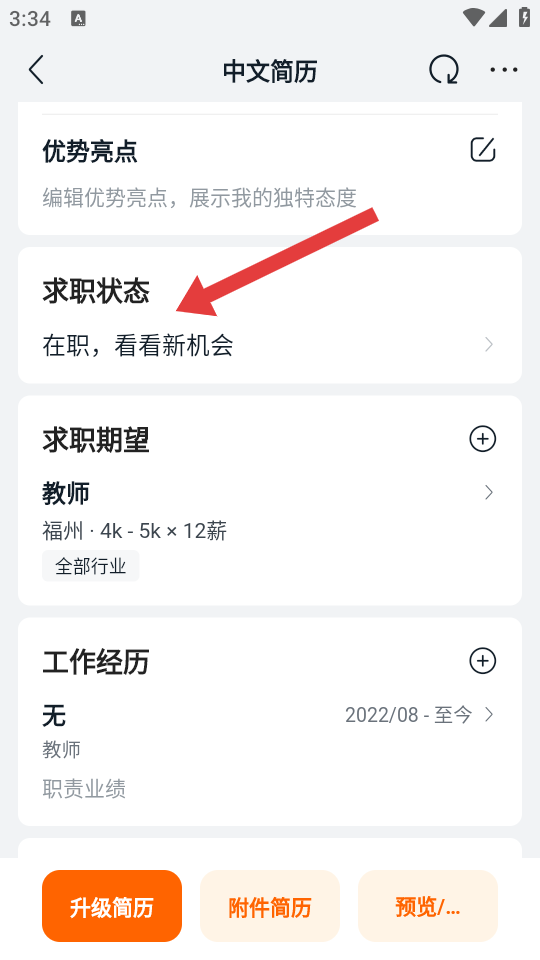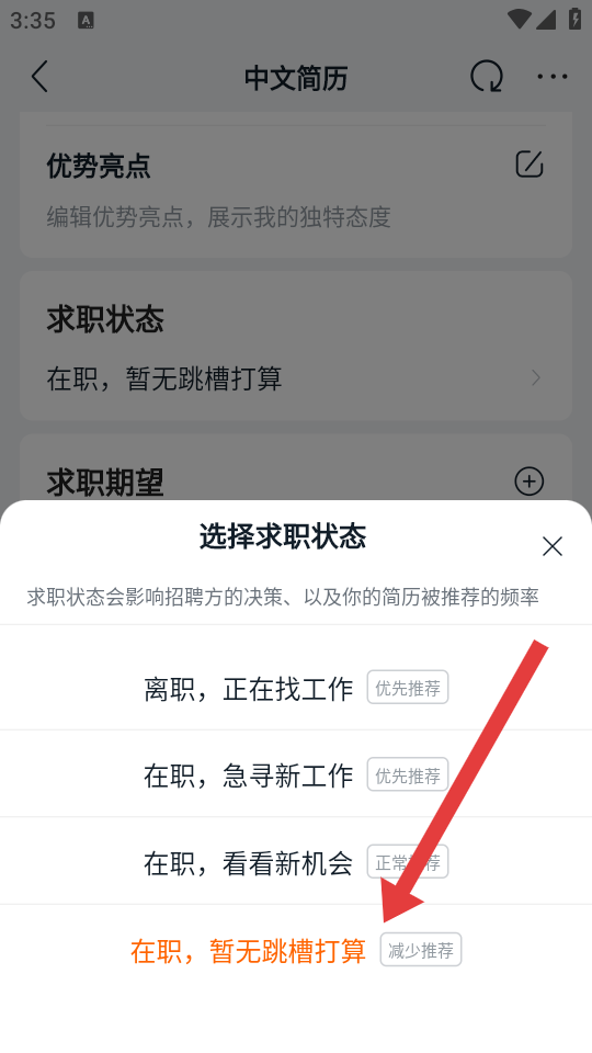 2、在中文簡(jiǎn)歷的頁(yè)面,點(diǎn)擊求職狀態(tài)的選項(xiàng),彈出選擇求職狀態(tài)的窗口。