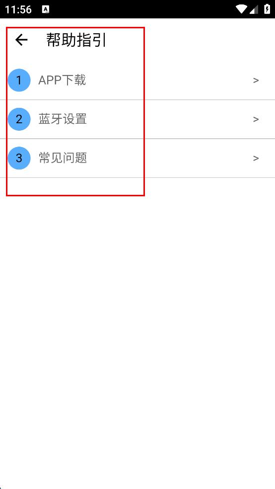 4、若在使用過程中遇到問題,可點(diǎn)擊登錄界面下方的“幫助指引”選項(xiàng),進(jìn)入幫助指引頁面,查看“APP下載”“藍(lán)牙設(shè)置”“常見問題”等內(nèi)容,獲取相關(guān)幫助。