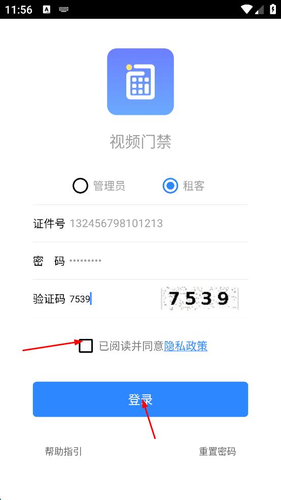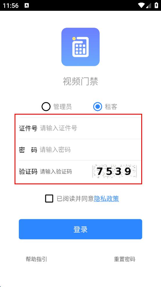 1、打開視頻門禁app,進(jìn)入登錄界面,根據(jù)自身身份,點(diǎn)擊“租客”選項(xiàng),將登錄身份切換為租客。