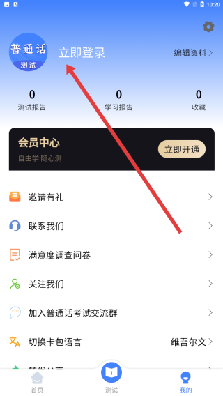 1、打開準橙普通話測試APP,在首頁點擊底部我的圖標,進入包含會員中心、功能選項的個人頁面。