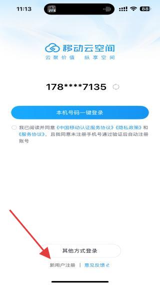 1、打開移動(dòng)云空間APP,點(diǎn)擊下方新用戶注冊(cè)的按鈕。