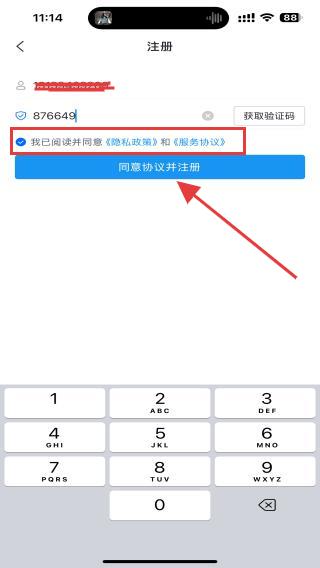 4、注冊(cè)前,需要勾選我已閱讀并同意隱私政策、服務(wù)協(xié)議,再點(diǎn)擊同意協(xié)議并注冊(cè)的按鈕。