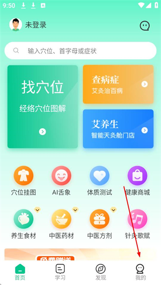 1、打開(kāi)灸大夫app,進(jìn)入首頁(yè),點(diǎn)擊底部導(dǎo)航欄中的我的選項(xiàng)。