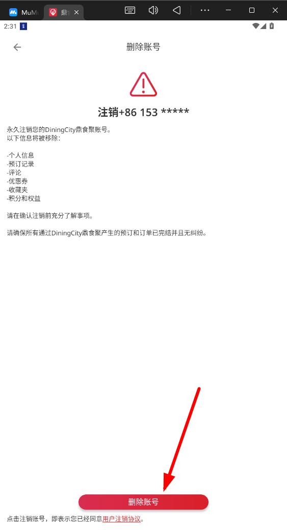 4、在刪除賬號(hào)頁面,仔細(xì)閱讀相關(guān)提示信息,確認(rèn)后點(diǎn)擊下方的刪除賬號(hào)按鈕,按照提示完成注銷操作。
