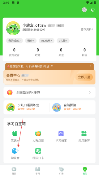 1、打開英語趣配音APP,點擊底部導航欄我的,找到學發(fā)音功能入口并點擊進入。