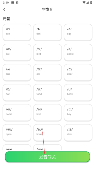 2、在學發(fā)音頁面,點擊發(fā)音闖關按鈕,選擇對應的音標或發(fā)音練習關卡。