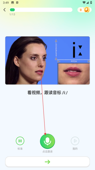 3、進入闖關練習界面后,觀看視頻中的口型、發(fā)音示范,點擊點擊跟讀按鈕,跟隨標準發(fā)音進行模仿朗讀。