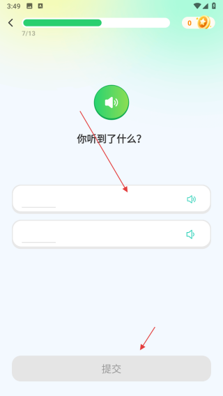 4、完成跟讀或聽力類練習后,根據提示完成內容選擇或填寫,點擊提交,獲取AI對發(fā)音的評分與糾錯反饋。