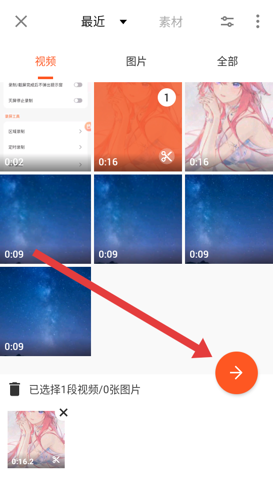 2、在素材選擇界面選取目標視頻素材,點擊右下角進入視頻編輯界面。