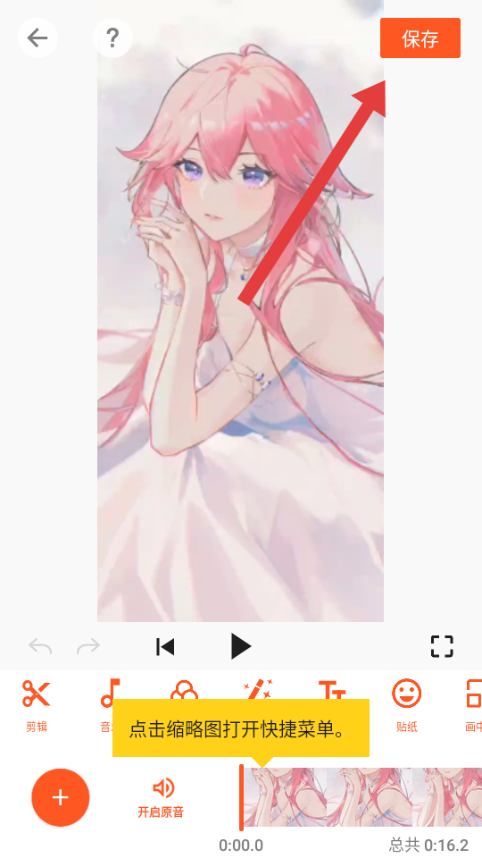 3、在視頻編輯界面,可進行剪輯等操作,完成后點擊右上角保存。