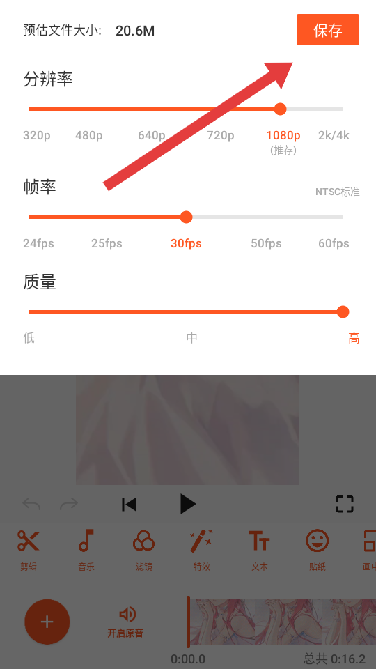4、在保存設置界面,調(diào)整分辨率等參數(shù)后,再次點擊保存,即可完成視頻剪輯。