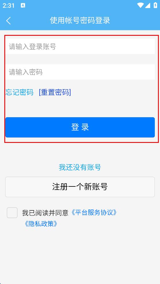4、在使用帳號密碼登錄界面,輸入登錄賬號和密碼,勾選我已閱讀并同意協(xié)議,隱私政策,點(diǎn)擊“登錄”按鈕。