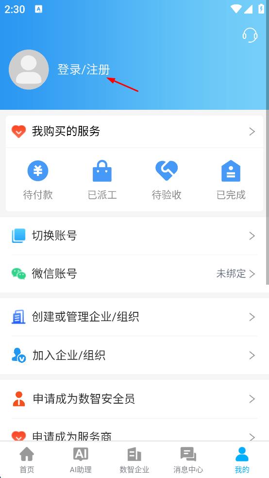 3、在“我的”頁面,點(diǎn)擊“登錄/注冊”選項(xiàng),進(jìn)入使用帳號密碼登錄界面。
