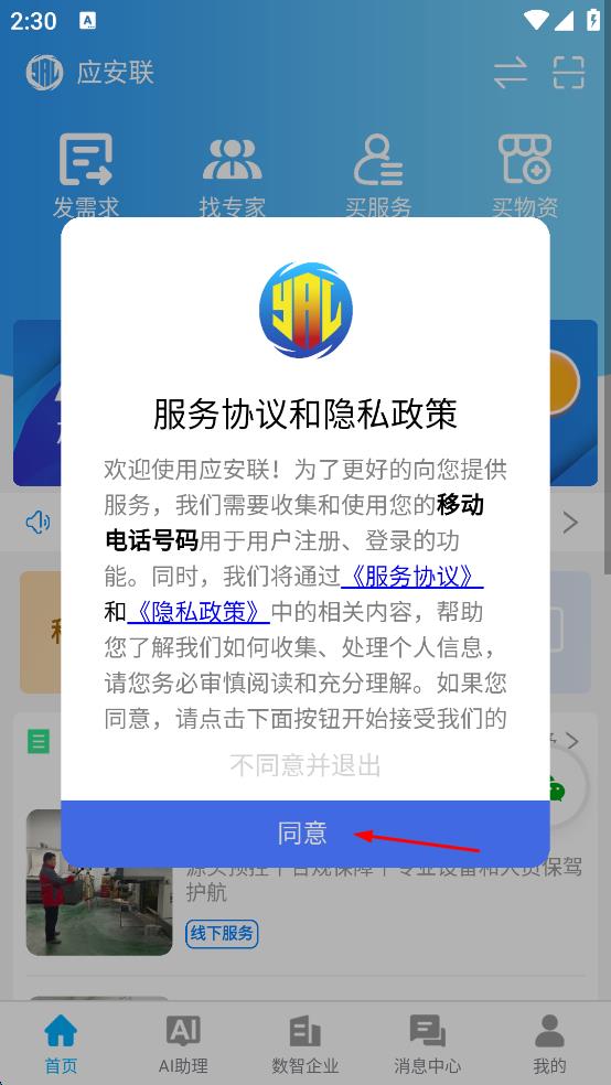 1、打開應(yīng)安聯(lián)APP,出現(xiàn)服務(wù)協(xié)議和隱私政策頁面,仔細(xì)查看后點(diǎn)擊“同意”按鈕。