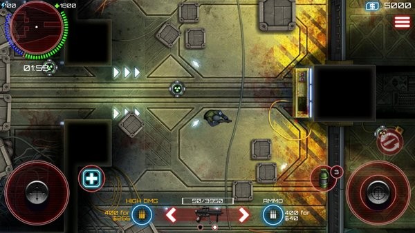 利用左右兩個虛擬搖桿來操作主角的移動、瞄準(zhǔn)與射擊,并利用俯瞰的角度讓玩家可以全方位的掌握戰(zhàn)況,全新體驗不一樣的感覺。