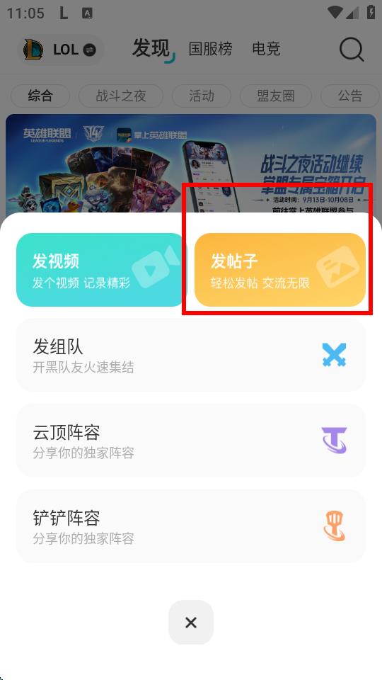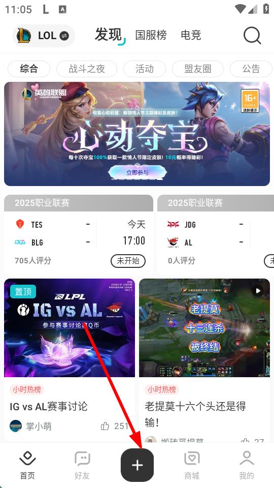 1、打開(kāi)掌上英雄聯(lián)盟App,進(jìn)入發(fā)現(xiàn)頁(yè)面,點(diǎn)擊底部中間的+號(hào)圖標(biāo)。