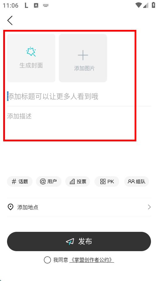 3、進(jìn)入發(fā)帖界面后,可以選擇生成封面或添加圖片,然后輸入帖子標(biāo)題和描述內(nèi)容。
